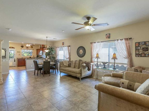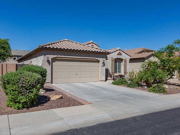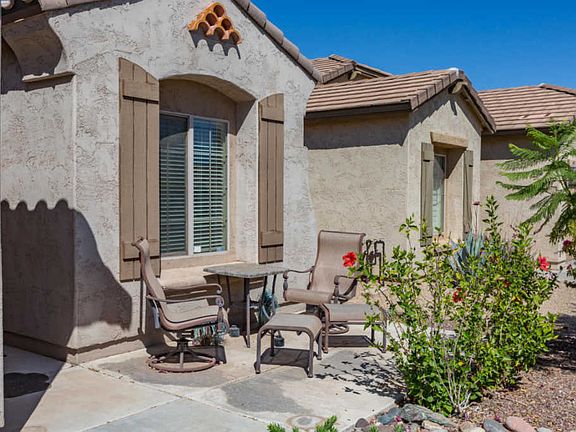 You'll love this great family home in Bella Via offering 3 bedrooms & 2 full baths in 1648 SqFt with an open great room floor plan. The kitchen features staggered maple cabinetry with crown molding, stainless appliances, granite countertops, gas range, breakfast bar seating & pantry. The low-maintenance backyard is complete with covered patio with ceiling fan, extended concrete patio and desert landscaping. The master bedroom has a private bath with dual sinks, separate tub & shower and walk-in closet. Laundry room has built-in shelving! Other features include a 3 car tandem garage with service door & storage cabinets, water softener, security system, carpet & tile flooring throughout & ceiling fans. Don't miss out...See this home today!