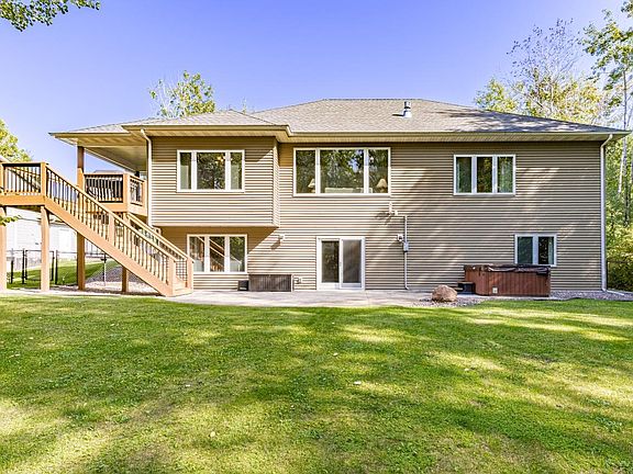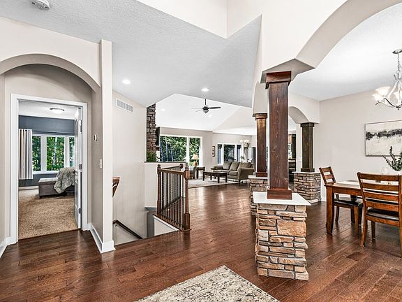 Welcome to the home you’ve been waiting for where style, comfort, and everyday luxury come together in perfect harmony. This 2012 custom-built ranch is the kind of home that makes people stop planning to build, because you simply can’t build it better—and it’s available now. Inside, rich wood tones and vaulted ceilings set the tone for sophistication. The stately pillared formal dining room makes a striking first impression, leading into the open living room and kitchen. A floor-to-ceiling stone fireplace anchors the living space, while a wall of windows frames the private backyard. The kitchen is a chef’s dream with a large island that seats four, tiled backsplash, walk-in pantry, and space for casual dining. A deck sits just off the kitchen, complete with dual pull-down sun shades so you can savor the light without reaching for sunglasses.The primary suite is a true retreat. There is a generous walk-in closet. The ensuite bath evokes a spa experience with a double vanity, soaker tub, and gorgeous walk-in tile shower. A second main-floor bedroom offers versatility for guests or an office, and a powder room completes the main floor. The walk-out lower level is designed for entertaining, with an expansive rec room, wet bar, two oversized bedrooms, and a full bath. Step out to the stamped concrete patio and enjoy the fenced backyard to watch your pets or littles,or relax on the shaded side deck above. Every detail reflects thoughtful updates: new hardwood and luxury vinyl flooring, sliding doors, upgraded kitchen appliances, Electrolux washer and dryer, new overhead garage doors, custom shelving, gutter shields, blown-in insulation, and more. With a heated 3-car garage and abundant storage, this home isn’t just beautiful, it’s built for effortless living. Here, every day feels like the life you’ve always imagined.