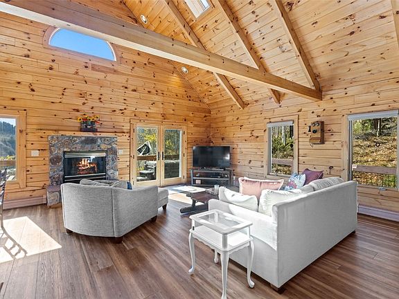 Cozy log cabin 3.5 acres with trees, great sun and wildflowers!! Enjoy pastoral views from south-facing deck while luxuriating in your hot tub. This 3 BR/3 bath home + 2nd living space has an open LR/K area, vaulted ceilings, cozy gas fireplace & wrap-around deck on the main level. Kitchen with granite countertops, hickory cabinets, a double oven, tile flooring & newer gas range. The upper level has a loft for your workstation and a large primary suite w/ a walk-in closet. Main bath has a double vanity, shower with frame-less glass enclosure and the secondary bath has a vessel sink, chiseled granite countertop, newer tile surround. Newer LVP floors, updated bath faucets/fixtures, custom built-ins under stairs, tons of storage and a big 2 car garage. Well has a newer pump. Cell phone and high speed internet service are available.