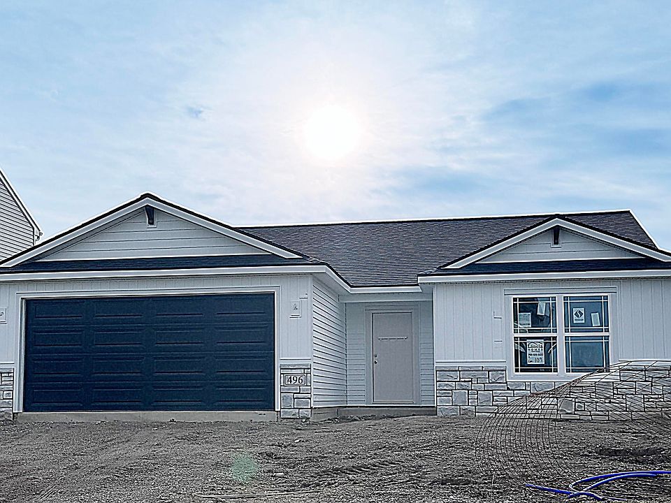 Lancia's Hampton ranch with 1,326 sq.ft. is located SWAC off Hwy 14 on a cul-de-sac Pond lot! Great Room has a cathedral ceiling and is completely open Nook and Kitchen. Home has 3 Bedrooms, 2 Baths, 2-Car Garage and 12 x 10 Patio. Kitchen has island with breakfast bar, ceramic backsplash, stainless appliances microwave, smooth top range and dishwasher with Pantry. Allowance for fridge, washer and dryer which will be installed after closing. Separate Laundry Room with closet off Garage. Owner Suite Bedroom off Great Room has walk-in closet and private Bath with single sink and 5' shower. 3rd Bedroom could be Office or Bonus Room. Vinyl plank in Great Room, Kitchen, Nook, Pantry, Foyer, Baths and Laundry Room. Garage is finished with drywall, paint, attic access with pull-down stairs. Elevation shows stone and shakes. This is a Smart home Simplx Smart Home Technology - Smart Lock Front Door Lock, Smart Thermostat, Video Doorbell and Free one year smart home access. 2-year foundation to roof guarantee and Lancia's in-house Service Dept. (Grading and seeding completed after closing per Lancia's lawn schedule.)
