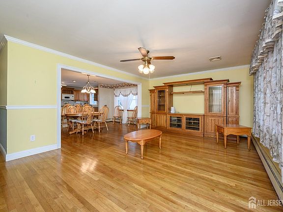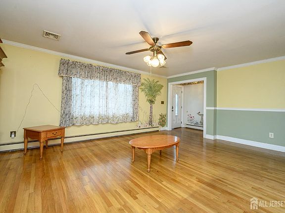 Beautiful 3 Bed 2.5 Bath Brick Ranch with Master Suite, 1 Car Garage, and huge Finished Walk-out Basement in the heart of Roselle Park is sure to impress! Situated on a large lot on a quiet street in a prime commuter location, close to the Garden State Parkway, 1.3 miles to the train station, near all district schools, shopping, dining and more. Step in to find a spacious, light and bright living room with hardwood floors that extend throughout, crisp custom moldings, and a large picture window that brings in tons of natural light. Living room flows seamlessly into the expansive formal dining room with table and chairs included for easy entertaining. Lovely eat-in-kitchen offers ample cabinet storage, ceramic flooring, garden window for your herbs, and center island with seating for 4, along with access to the side yard. Down the hall, find the main full bath with blissful jetted tub and dual vanity, along with 3 generous bedrooms, inc the Master Suite. MBR boasts its own upgraded full ensuite bath with accessible stall shower. Massive walk-out finished basement adds to the package, boasting a large 2nd eat-in-kitchen, sizable family room with sofas, 80 3D TV set with built in theater & entertainment unit with Fireplace included, a spacious laundry room with convenient 1/2 bath, plenty of storage space and a workshop area. Huge park-like backyard features a paver walkway and patio, retractable awning, peaceful koi pond, and plenty of space to play, completely fenced-in for your privacy and comfort. All of this and more, ready and waiting for you. Don't miss out! Come and see TODAY!