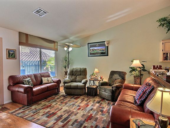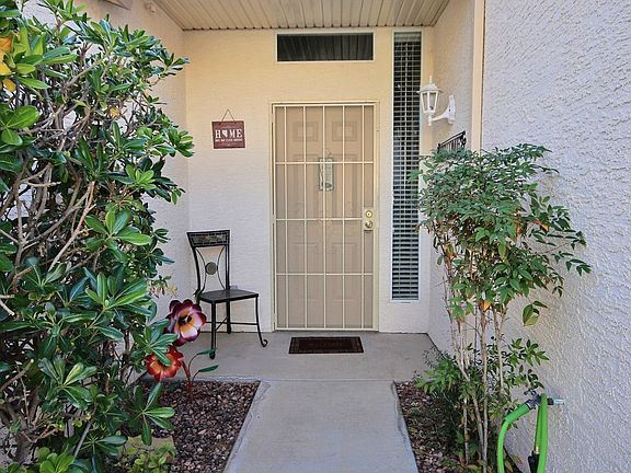 This tastefully decorated and furnished 2 bedroom/2 bath home is move in ready. The kitchen is equipped with a large raised bar and custom island. The pantry has an etched glass door. Upgraded floors are throughout with tile in the entryway, kitchen and bathrooms, pergo flooring in great room, master and guest bedrooms. Double French doors from the great room lead to the back patio, fully covered for day and night time enjoyment. Epoxy floor in garage, with additional shelving and golf club holders. Many custom additions. Must see to appreciate! Community Pool and Hot Tub to enjoy without the maintenance!