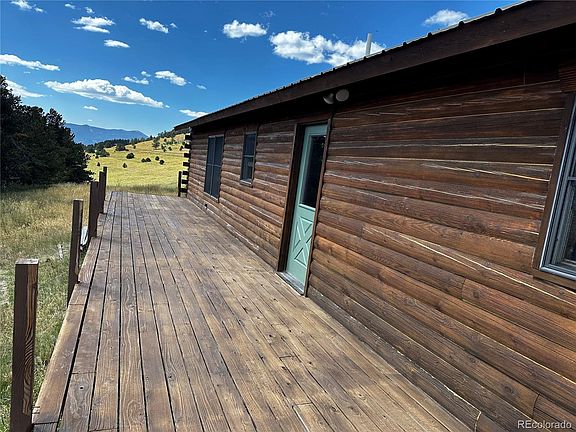 Looking for that perfect mountain get a way cabin big enough for the whole family? This it. this 3 bedroom 2 bath log cabin sits high on the hill looking over the beautiful Wagon Creek Ranch and the Mt Blanca range. This cabin has a brand new solar system a brand new well has been drilled and has been blasted, stained and new chinking to the logs. With the well filling 2 under ground cisterns you will never run short on water. The attached garage is big enough to house all the mountain toys that you enjoy. There is 83 miles of ranch roads to enjoy riding atvs or side by sides . take an evening ride around the ranch and enjoy watching the elk and mule deer come out into the meadows to feed . There is a hunting program on the ranch that allows you to hunt about 9000 acres of gated fenced private land. The cabin comes completely furnished so all you need is your toothbrush and your toys.New deck railing is getting installed soon.