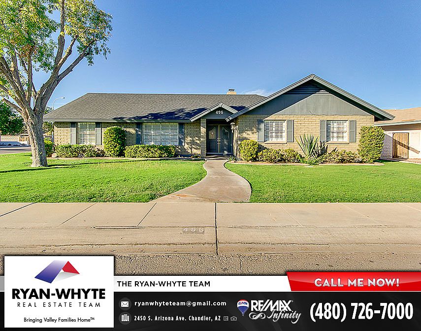 Standout home in the heart of Chandler! Complete remodel with custom tile and carpet, beautiful quartz counters, brand new stainless steel appliances, new paint inside and out, satin nickel hardware throughout, updated bathroom vanities w/ quartz and new bathtub tile surround and new plumbing. Seller just installed a BRAND NEW ROOF! You'll love this floorplan w/ oversized bedrooms, walk-in closets, formal living & dining room & a kitchen that opens to a beautiful family room w/ brick fireplace, custom built-in shelves, vaulted ceilings & faux wood beams. Step out the French doors to the extended covered patio and large grassy backyard. Detached garage with an RV gate and extra slab allows boat/toy storage w/ NO HOA!!! You will love this non-cookie cutter home in an awesome location!!! Located at 496 W Ironwood Dr, Chandler AZ 85225 in Thunderbird Estates. MLS 5517475. 3 bedrooms, 2 bathrooms, single level, 2520 square feet, 2 car garage. Please contact The Ryan-Whyte Real Estate Team at REMAX Infinity 480-726-7000. Website Link: http://www.ryanwhyteteam.com/listing/cms/mls-5517475-496-w-ironwood-drive-chandler-az-85225/ You Tube Link: https://youtu.be/338-C9x2MQA
