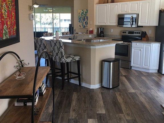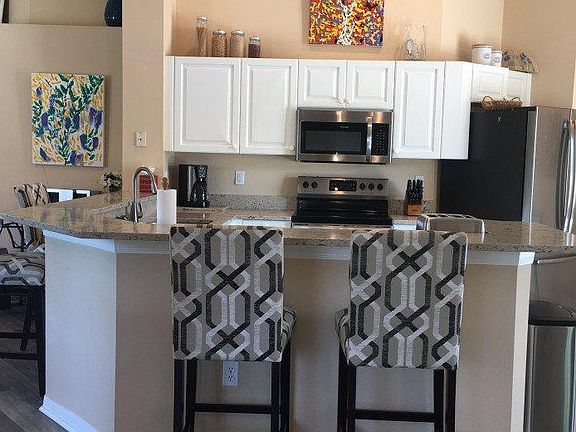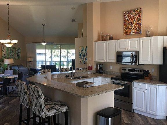 Beautifully decorated with two modern, leather reclining leather sofas in Great Room, two 60 inch Samsung 4K TVs (Master and Great Room), glass dining room table, gorgeous desk in den/3rd bedroom, comfy lanai furniture set, French Bistro kitchen table/chairs, four bar stools, white bedroom sets, 500 thread count sheets and high end duvets