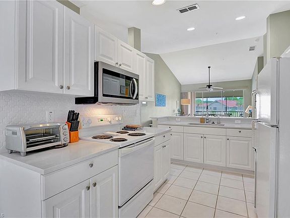 Impeccably maintained, furnished condo in gated Carlton Lakes neighborhood. Stylishly finished with luxury vinyl plank flooring and new countertops/faucets in kitchen and bathrooms, this home is move-in ready! This second floor unit offers vaulted ceilings and serene lake views, split bedrooms, and an easy-living floor plan. Enjoy Lakeview's pools and Carlton Lakes community amenities including tennis, a fishing pier, fitness room, clubhouse and more! Centrally located for ease of access to I-75, minutes from beaches, shopping, and all that sunny Naples has to offer.