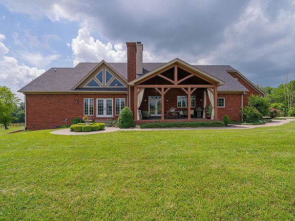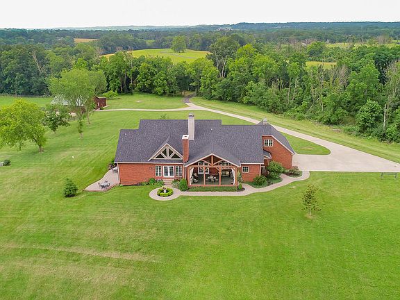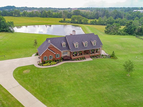 If you're looking for your own private, peaceful retreat, look no further. This unique property located in desirable Oldham County provides 78 acres of lush countryside with a stunning home, horse barn and pond. There is a creek that runs through the property as well. This cape cod style home is positioned perfectly back a long, paved drive with no other homes in sight and prime views of the pond with fountain. The home was designed and built by the current owners 17 years ago with every detail taken into consideration in the well thought out post and beam construction plan. The end result is a stunning but comfortable Kentucky home with all the conveniences one expects with a rustic flair.The exterior is all brick and real stone with a large inviting covered front porch. Roof is brand new In the rear is a lovely covered patio with real stone fireplace which provides a wonderful place to relax and view the pond and acreage. The home walks out to the side where there is another huge patio space for entertaining. Upon entry, you'll notice the solid hickory floors, solid pine doors, trim, beams and ceilings. An extraordinary office/study is just to the right with double entry doors and a wall of built in cherry cabinetry. Straight ahead you'll see a wall of glass windows and doors (all Pella throughout the house) providing natural light and expansive view to the property and pond. A wood burning two-sided fireplace with floor to ceiling stone is the focal point of this room which also has vaulted solid pine ceilings. The warmth continues into the open kitchen, dining and hearth room with solid hickory floors. The kitchen boasts solid maple cabinets and a huge island for gathering. The large window over the sink looks out onto the covered patio and gives another view of the pond. Other notable features of the kitchen area are a built-in desk space, beam detailing over the sink, vaulted pine ceiling, pull out trash, and incredibly large walk-in pantry. In the hearth area