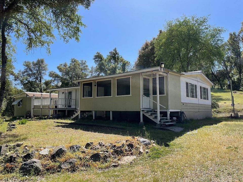 Opportunity awaits! Take a look at this accommodating home on a beautiful and versatile piece of property located less than 10 minutes to the town of Mariposa! This 2 bedroom, 2 bathroom manufactured home features 1258 square feet of living space and sits on 4.83 usable acres, perfect for recreation, gardening, livestock, horses, and future development in the form of a second home, shop, garage, you name it! There is a large screened-in porch prior to entering the home, which is great to take in the scenery. Upon entering the home, you will notice the open and expansive living space, kitchen, and dining room, which is more than suitable to get comfortable in. The home features 2 bedrooms, one being a master suite with a full bath and a private deck accessible from a sliding glass door. There is also a laundry room in the home, with an attached mud room leading out to the exterior and backyard. As a bonus, there is a detached bonus room, suitable for an office, storage space, or living space. The property also crosses the road, making it highly suitable for a second residence being built separately from the main home. The home is in need of some TLC and is being sold as-is, so this will have to be a cash-only purchase. The potential is here - come see it for yourself!