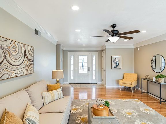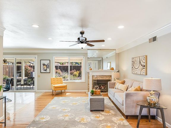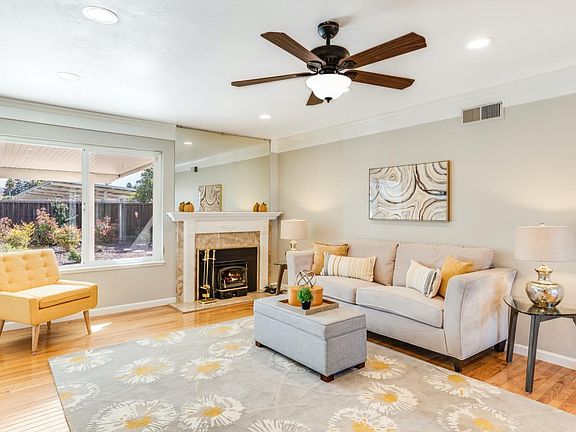 Stunning 4 bed, 2 bath home in highly desired Blossom Valley! This bright & spacious starter home has a fascinating kitchen! It has grayish custom cabinetry, glass-mosaic backsplash, which coordinates well with the interior fresh paint & granite counter-tops. All high-end appliances are in included in the sale! There's a custom buffet hutch, that can be used as a coffee brewing station. The inviting living room has oak hardwood floors, recess lights, surrounded by crown moldings & a wood-burning fireplace. The fireplace has marble surround, also located in the entryway & kitchen flooring. The dual pane windows bring in lots of ample natural light. The master-suite is spacious & has a full paneled mirrored closet doors. Renovated master-bath has RAIN dual shower panel, with tile surround, and much more. The backyard oasis is perfect to gather friends & family, it features oversized cover patio, ceiling fans, stamped-concrete patio & walkways, drought tolerant plants on a drip system.