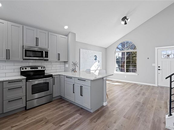 Welcome to this remodeled home in Briargate with Pikes Peak views from the master bedroom and brand new deck! Pulling up to the home you will notice the newly painted exterior, new garage door, freshly xeriscaped front yard and brand new front door. The kitchen features premium soft-close kitchen cabinets, stainless steel appliances and a peninsula style bar featuring premium granite countertops. Large windows provide a lot of natural light in the dining room that includes an open pantry, modern designer black light fixture and custom modern handrails made locally. From the dining room head down to the living room featuring a gas fireplace and new surround with an Alaska Gray Natural Marble split-face ledger. Brand new trex deck with premium custom handrails. Enjoy the amazing views of Pikes Peak while you're out there. Fully updated powder room with a custom natural stone vanity top. The master has a fully updated private bath with a luxury shower, frameless shower glass, new double vanity with custom natural stone vanity top and new lighting.
