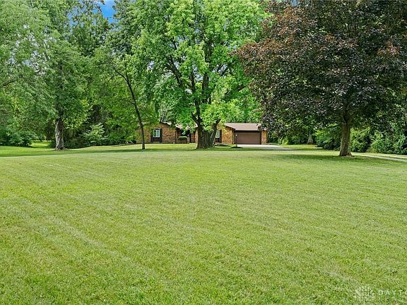 Enjoy country living with the convenience of town nearby on this beautiful 2-acre property! This sprawling brick ranch offers 2,432 square feet of living space, starting with a charming courtyard that leads into an entryway. The split floor plan places bedrooms on the left and living areas on the right. The large kitchen features ample granite counter space, a counter bar, and is adjacent to a spacious dining room. A tucked-away laundry room off the kitchen adds convenience. The family room addition enjoys a skylight and a cozy brick hearth fireplace, walks out to a screened-in porch, overlooking the expansive yard. An office sits of the FR and could be easily transformed in to a 5th Bedroom. The east wing houses four bedrooms and two full baths, including a master suite with an en-suite bath. The smallest bedroom, accessible from the master, is perfect for a nursery or study. A large updated bath serves the other bedrooms. Additional features include an attached 2-car garage, ample driveway parking, and a 24x33 pole barn with three doors (one 10 ft high and two 8 ft high), Radon system and water softener. Recent updates include new roof (2019), a new HVAC system (2021), and a tankless water heater (2021). The floored attic above the garage provides extra storage. Located in Bath Township with no city taxes, this home is ideally situated between Fairborn and Huber Heights. Enjoy the tranquility of mature trees and open land in this lovely countryside setting.