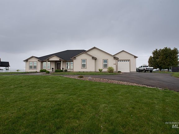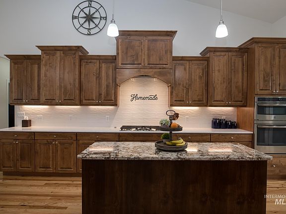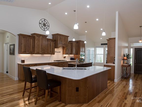 Placed at the top of the hill on 1+ acres with views for miles, this simple, yet stunning, home is the perfect balance of beauty and comfort. Gorgeous hickory wood floors complement quartz and granite counters and subtle ash cabinetry. Soaring ceilings and an open floor plan create a calming spaciousness. From the double pantry to master bath connecting to the laundry, even the practical details are here. The RV garage is 25x45 with a 14' high door and has full hookups. The oversized 2 car garage is 29.5'x29'. Stucco siding, large covered back patio to enjoy the outdoor aesthetics. This is simple elegance in the country. Come experience it for yourself!