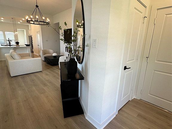Wood-look flooringQuartz countertopsHerringbone tile backsplashFront flex roomVaulted ceilingsChef-inspired kitchenMassive center island