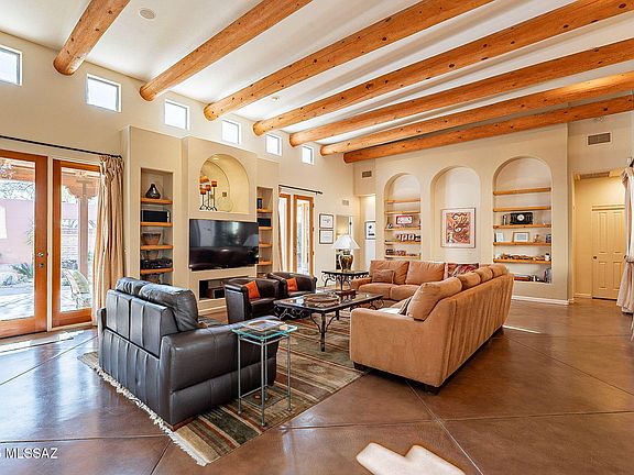 Another of the gems in the sought after Garrison. Enter thru charming courtyard to one of three outdoor spaces to enjoy. This unit was created with the aid of one of Tucsons great interior designers leaving no page unturned. Gorgeous tall beamed ceilings , double sets of french doors leading out to beautiful patio w/ piped in music, small water feature and mature gorgeous fruit tree and landscaping.Wrap around to 2nd patio which features fireplace and deluxe built in barbecue.Lovely primary bedrm with door to patio and huge walk in closet and generous bathroom.Stunning great room with dining area and separate sitting area next to fireplace. A devine cooks kitchen with all the amenities needed.
