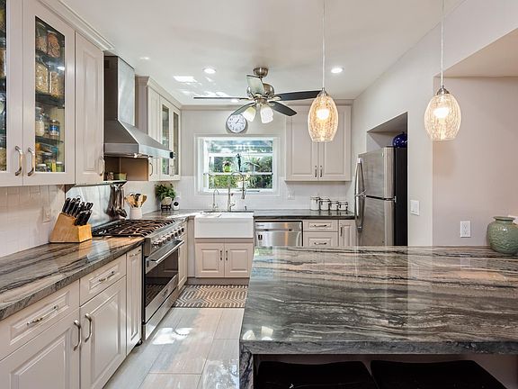 This enchanting 2-story, 4-bedroom, 2-bath home is the epitome of Southern California living, boasting a refreshing pool and a detached garage for all your lifestyle needs. Enter into this charming residence and discover an open and inviting floor plan, bathed in natural light. The spacious living room features a cozy gas/wood burning fireplace, creating a warm and inviting atmosphere for gatherings and relaxation. The updated kitchen was fully gutted & renovated in 2021-2022 offering modern SS appliances, Viking gas stove, Italian Porcelain farmhouse sink, Galapagos quartz countertops, staggered subway backsplash and ample counter space! It's perfect for preparing delicious meals and enjoying them in the adjacent dining area. The four bedrooms are generously sized, providing plenty of space for rest and relaxation. Each room offers its unique character. With two well-appointed bathrooms remodeled with luxury Greek marble flooring, designer rain shower & bluetooth speaker mirrors, mornings will be a breeze, and your guests will feel right at home! The outdoor space is a true haven, highlighted by a 13,000 gallon - 8ft pool, perfect for cooling off during the hot Encino summers. The expansive backyard is ideal for hosting barbecues, lounging by the pool, or enjoying outdoor activities with family and friends. The detached garage offers ample storage space and the potential for a workshop, home gym, or creative studio, the possibilities are endless! The front yard features a trellis-designed redwood fence, a self-watering organic Chefs Garden, lemon, fig, and avocado trees, along with a dry river bed and bridge. The paved multi-car driveway leads to a side yard adorned with privacy hedges and drought-tolerant succulents. Located in a prime Encino location, you'll enjoy easy access to top-rated schools, parks, shopping, dining, and entertainment.