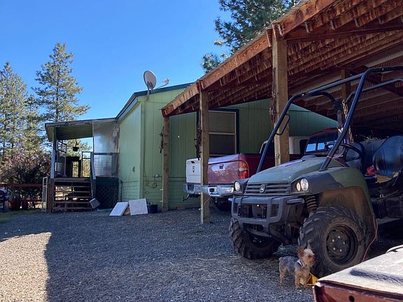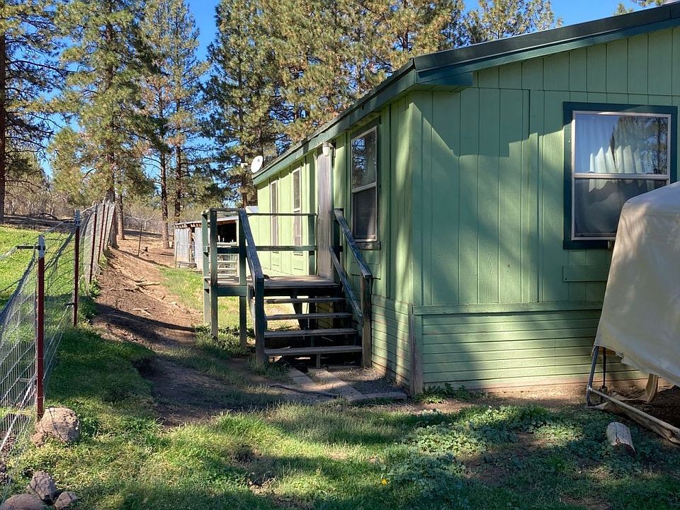 1985 3 bd/2bath MH nestled among the pines west of Bly. Interior features Bamboo flooring, tile in the kitchen, bedrooms carpet, pellet stove and propane stove for heat. 3 car open garage, pump house with storage, wood shed, several storage buildings. Relaxing covered porch overlooking the water feature and the pastures. Property is fenced and cross fenced. Sprague River frontage on the north part of property with a wonderful swimming hole, fishing on your own property and fenced summer pasture for a couple head of cattle or horses. Backs up to Forest Service Land.