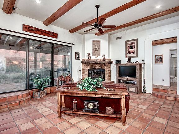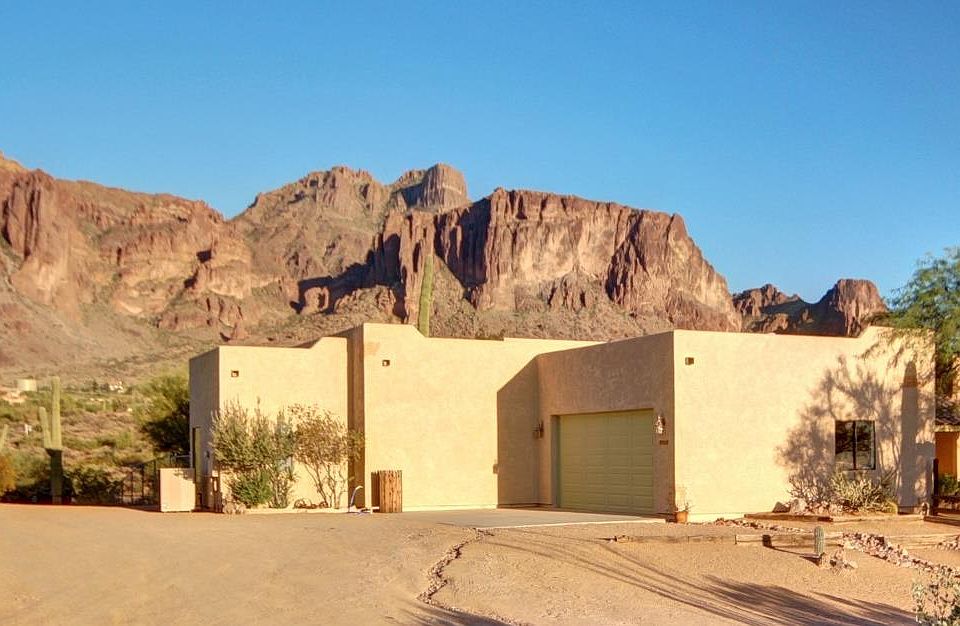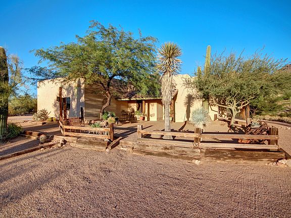 Absolutely beautiful custom built home sits on 2.5 acres of land just below the Superstition Mountain. This home boast a large office & 3 bedrooms all with separate patios to enjoy the mountain views & city lights. Enjoy the Old West feel with lodge pole accents, exposed beam ceilings, Saltillo tile throughout,and a gorgeous stacked stone fireplace in the Great room. Kitchen has custom cabinets, tiled counters,breakfast bar, & large pantry. Master bath has a claw foot tub, separate tiled shower,and his & her sinks. Split bedroom floor plan design. Custom features include smooth finish drywall with no baseboards, upgraded hardware through out, custom fire place mantel, Alder doors,oak blinds, new garage door & opener, new lighting with led lights, new exterior paint, New Trane AC, new well pump & new desert front landscaping. On the backside of the property there are 3 covered 20 x 20 horse stalls, a hay/tack barn, horse arena, large storage building, & a private Saloon!! Property is conveniently located to many outdoor activities & trail heads.