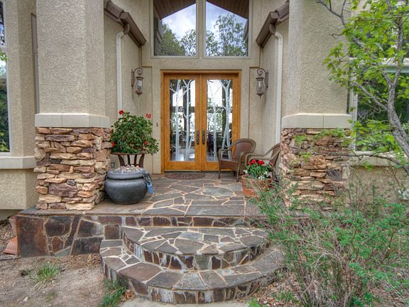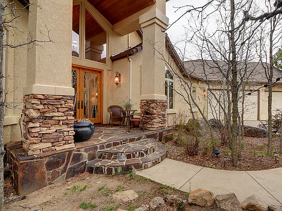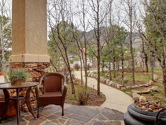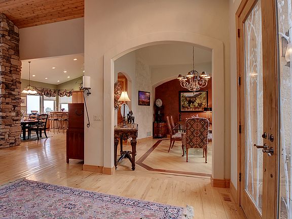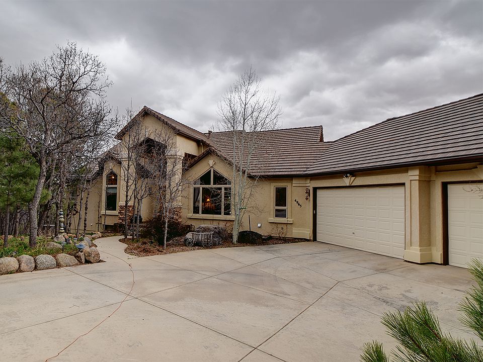 Colorado Custom ranch style home with an open floor plan, main level living, city and mountain views on a very private 1.07 acre lot. Beautiful architectural design showcases the lovely setting. Custom built with rich woods, lots of windows, and stone accents. Covered flagstone front porch & double glass front doors with etched aspens. Living room has peaked aspen wood ceiling, floor-to-ceiling stone fireplace & floor-to-ceiling wall of windows. 8' alder doors on main level and spacious rooms throughout. Hickory floors in entry, dining room, kitchen, powder, hall & master bedroom. Eat-in kitchen features a stone wall that houses a gas fireplace & beverage center w/wine frig. Additional kitchen features include cherry cabinets, slab granite counter, and a 5 burner gas range. Kitchen opens to composite deck with stunning views. Main level office with cherry bookcases & peaked ceiling. Spacious dining room with mountain views. Main level master has a private composite deck, see through fireplace, huge closet w/3 sections and lovely 5-piece bath that offers dual cherry vanities, marble floors, fireplace & glass block shower w/2 shower heads. The main floor has been wired for sound with built in speakers. Lower level has 9 foot ceilings and 8'sliding doors to a stamped concrete patio. Walk out lower level features a large family room w/gas fireplace, exercise room & theater room with wet bar , three spacious bedrooms and two full baths. Entertain or relax in your beautiful outdoor living areas complete with waterfall feature and hot tub, while taking in the views and complete privacy. Security system is hardwired, but not active. 4th BR on the lower is being used as an office. 5th BR is being used as a workout room.