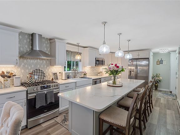The all-new kitchen is a chef’s dream, featuring stainless steel appliances, a large island with bar seating, and stylish finishes throughout. The fully renovated first floor boasts new flooring, fresh paint, and high-quality upgrades that make it move-in ready.