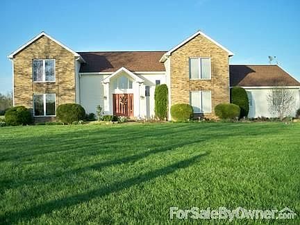 This 5-bedroom, custom-built home is situated on almost 3 acres in a peaceful, country setting. Enter into the large foyer which opens to the great room with a vaulted ceiling and a floor-to-ceiling, full-brick, wood-burning fireplace. The recently remodeled eat-in kitchen features an abundance of cabinets, U-shaped counters, planning desk and recessed lighting. The dining area and family room showcase a wall of windows, vaulted ceilings, and a wood-burning fireplace. The spacious master suite features his-and-her walk-in closets and a stunning private bath with ceramic tile, air bubble tub, and over-sized dual shower with granite bench. With the high ceilings in the basement, there is great potential to add more living space. The lovely, spacious yard boasts extensive landscaping and an aggregate patio located off of the family room and master suite. You must see this home to appreciate all of the unique custom features, as well as the breathtaking views surrounding the home.