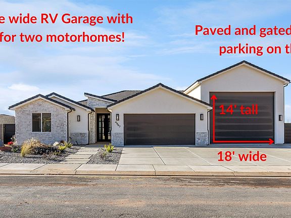 Double RV Garage. This beautiful home offers space for all your toys. The double RV garage door measures 18' wide and 14' tall. The interior of the RV bay is 52' deep and 21'6'' wide, large enough to park two RVs side by side. The 2-car garage is 24' deep, big enough for your 4-door pickup. If you need more parking, check out the space on the side of the house: 12' wide, and concrete from the street to the back of the house. The back yard is big enough for a pool. Inside, you'll love the open floor plan and two master suites. The front two bedrooms share a hall bath. The house has two master suites, or a master and a casita. The casita bathroom has a door to the backyard, the perfect location for a pool bathroom. Seller is a Utah real estate licensee.
