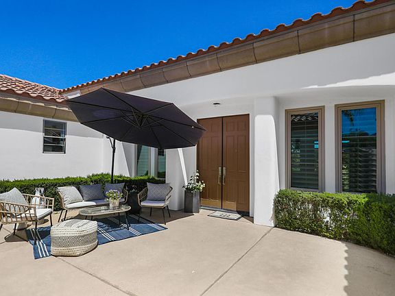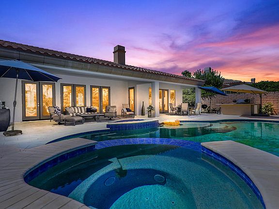 Buyer could not perform - back on the market!Highly upgraded and well-maintained home in one of La Quinta's premiere neighborhood-Talante. This Plan 4, the largest floor plan in Talante, boasts over 3850 square feet with 4 en-suite bedrooms (4th bedroom is a detached casita), powder room, bonus/media room, formal living-dining area and an office. Upgrades include; renovated kitchen, custom window coverings, beautiful neutral tile and added ceiling lights thru out, upgraded solid core doors and hardware, baseboards, custom build-ins, partial new windows, and newly upgraded master bath. The expansive backyard features travertine pavers with a large pool & spa, build-in BBQ and firepit. Three car garage with a mini split a/c system and storage cabinets. Gated development of 75 homes w/ low HOA dues, one of La Quinta most desirable community. Furnished per inventory list