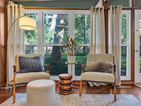 A true mid-century modern home that has 3 bedrooms, 2 full bathrooms, and 2 living spaces that offers ample room for comfortable living. The kitchen has been updated with modern features and looks out towards the wall of windows into a private backyard. There are two neighborhood pools you can enjoy with memberships that are just blocks away. The pools keep the nostalgic era of the neighborhood alive with the retro vibes! Darlington Park is nearby featuring tennis courts and a playground for more outdoor enjoyment. Don't miss this chance to own a piece of Tulsa History in this charming and historic Lortondale neighborhood!