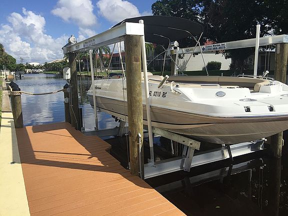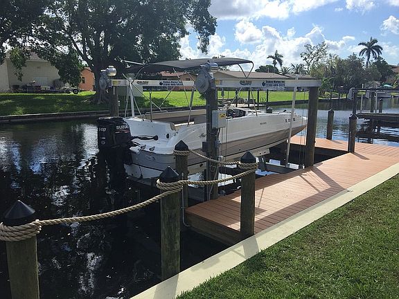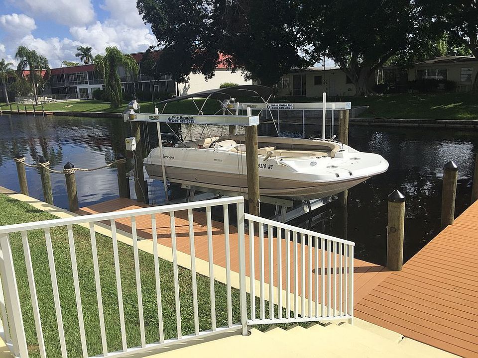 Corner Unit! Unit has its own PRIVATE HEATED POOL, PRIVATE PATIO, BARBECUE, BOAT DOCK AND 10,000 POUND LIFT!! Master Bedroom has its own private balcony overlooking the canal. Exceptional location with Yacht Club beach, fishing pier, tennis courts and more nearby!! Boating is a breeze with only minutes out to the river from the Bimini Canal!! Walking distance to restaurants and shopping!! New roof Feb 2022, replaced water plumbing July 2022, New AC/Heat unit 2022