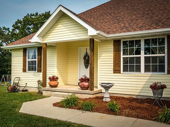Hilltop Retreat on 20 Acres with a Spectacular View. This home was built in 2012 with approx. 1,823 sq. ft., a 3 bedroom split plan with a large master suite, 2 bathrooms, large living room, and a eat-in kitchen in addition to the formal dining room. Property is crossed fence so bring your horses or raise a few head of cattle. Private, but with a view of the surrounding Ozark hills. This is a rare find with acreage and a newer home with popular open floor plan.