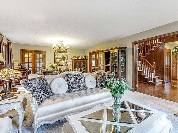 Your dream HOME in a private parkland, creeks, forest, and fruit trees. This all brick custom built home with over 4100 sqft fully finished, 16' high ceilings, 4+1 bedrooms, 4 baths, main floor great room, soaring ceilings, formal LR & DR w/ French doors, master bedroom and 2nd bedroom w/ 2 full bathrooms. Upper family room and den w/ 2 bedrooms and huge balcony. Fully finished basement w/ kitchenette, perfect for an in-law set up. Separate entrance to in-law apartment with its kitchen, water softener and purifier, sauna, insulated garage, 2 fireplaces, negative air iron fans, Tiffany style lights, etc. Steps to transit, shopping, amenities. A must sell!!!