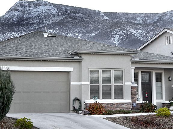 A SINGLE LEVEL HOME AVAILABLE IN MOUNTAIN GATE! Newer (2014) but not so new that it's sterile - this one has mature landscaping, trees, and VIEWS! GORGEOUS free-standing single family with all of the upgrades! Soaring 10' ceilings, a chef's dream of a kitchen - indestructible quartz countertops, tin backsplash, beautiful tall dark wood custom cabinets, plus that refrigerator! Great room, bedrooms are all down the hallway away from the living areas. Beautiful real wood floors in living areas, 2 bedrooms are carpeted. Master has enormous closet! Attached lanai out back, with gas fireplace and plenty of room for entertaining or snuggling. Back yard is surrounded by a wonderful ridiculously tall block privacy wall. Put your shoes on before you run around naked because it's graveled.