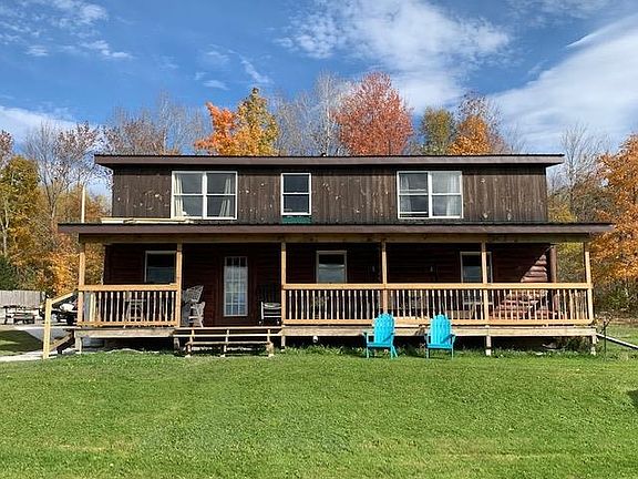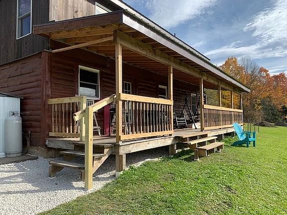 This log home features 3 bedrooms, 2 full baths, and a 2-car detached garage. There have been many updates over the last few years making this home move-in ready. The kitchen has newer stainless-steel appliances, a backsplash, a butcher block countertop, laminate countertops, and flooring. The bathrooms have been updated as well as a newer hot water heater, and many windows throughout. A full dormer was added on the back side of the house to add more usable living space upstairs. A metal roof installed 1-2 years old on the house and garage. This home sits on 6.58 acres. Picture yourself sitting on your new back deck, which was recently built overlooking a pond and has beautiful westerly sky sunsets. Or sit on your front covered porch surrounded by sliding glass doors sipping your morning coffee. Great location close to Smugglers Notch, Underhill State Park, and Mills River Park with great hiking and walking trails. Part of 2 lot subdivision approved by town. Listing Agent related to seller.