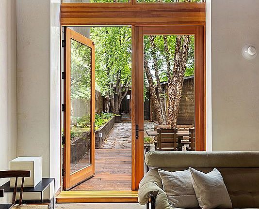 The ground-level entry welcomes you with its striking floating wood screen staircase. Honed concrete floors lead to a rear den featuring a rustic cast-iron wood-burning stove, while large Loewen windows and glass doors open seamlessly to a lush private garden.