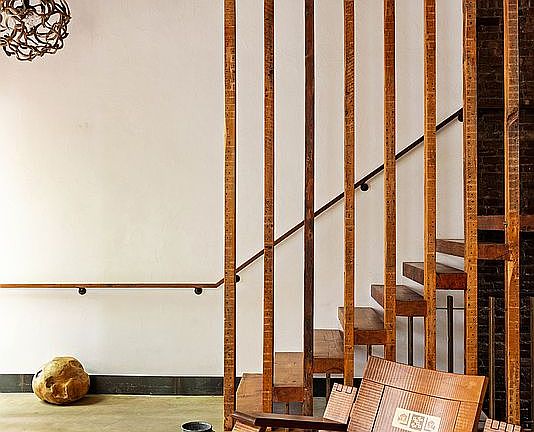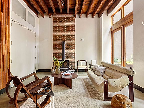 Every detail reflects material artistry: radiant heated wide-plank walnut floors, yellow leaf heart pine beams, reclaimed sequoia, exposed brick, hot-rolled steel, and Venetian plaster all contribute texture and depth. At its center, a sculptural floating staircase, crafted with mortise-and-tenon joinery, suspended between masonry and exposed original studs, anchors a soaring, light-filled interior with three wood-burning fireplaces.