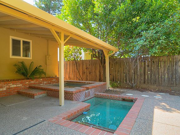 Turnkey 3 bedroom 1 story w/ gleaming oak hardwood floors, fresh paint inside & out & custom built in spa & mini pool by Geremia Pools! Full newer vinyl dual pane windows, crown molding, blinds & baseboard. VERY spacious covered patio, perfect for entertaining or play area for kids, plus an uncovered patio in the attractive fully landscaped back yard. Fireplace in family room. Updated bath & kitchen. Great value here - compare to flips without all these features selling nearby for $20-$30K more!
