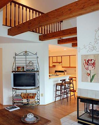Airy open penthouse w/ loft.Rustic beams in 2 story living/dining rooms center on 3 sided fireplace.MBR has beautiful bed nook w/ windows/vaulted ceiling.Attached super bath.Plentiful storage:Kitchen cabinets include lazy Susan,pantry,laundry w/ full size washer/dryer.Open 10 casement windows & 2 sliders for breezes.Light a fire for cozy winter evenings.Relax on balcony.SA ends 10/14.
