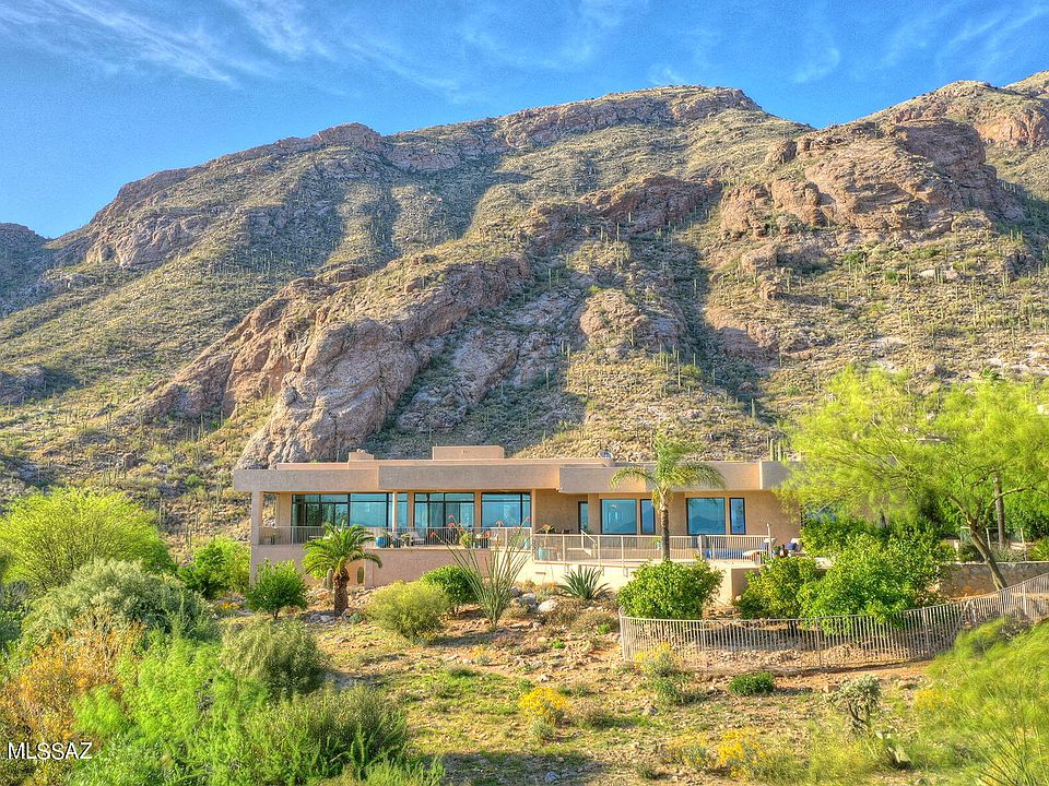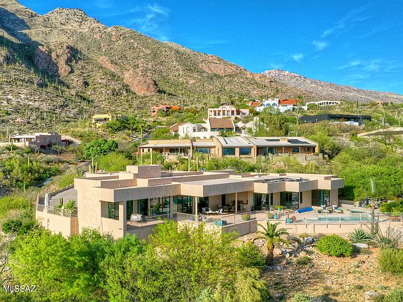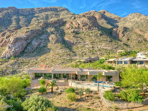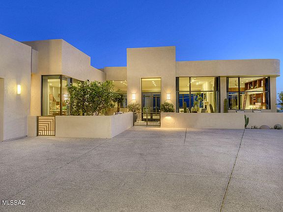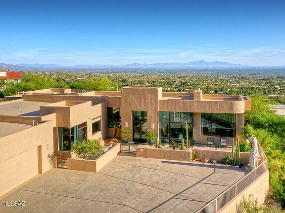 THIS IS IT! An absolutely gorgeous home at the top of Skyline Country Club with quality living at its finest. You won't believe the amazing Panoramic city views as well as majestic Catalina mountain views. A Contemporary style home is an entertainer's dream and has just about everything you could want in a home. Custom built by well-known Tucson builder LJ McCreary Home, Inc., and completed in 2007. Enter through the tall glass front doors where you are greeted with spectacular city views that will take your breath away. Without taking a step, just spin around and the mountains are so close you will feel like you can touch them. This gorgeous 4-bedroom split floor plan with 4 bathrooms, study, and an impressive home theatre room. Just trying to describe this home doesn't do it justice This beautiful home has exquisite porcelain tile flooring throughout, 12ft+tall ceilings, floor to ceiling windows, gourmet kitchen, custom coffee bar and wet bar for entertaining. There is a separate entrance from the east side of the home that enters right into the 1st primary bedroom with city views. En-suite bathroom, also has city views, a jacuzzi tub, separate shower, dual sinks, huge walk-in closet and private water closet including a bidet. 2nd primary bedroom with beautiful city views and En-suite bath with steam shower, dual sinks, another huge walk-in closet, and separate water closet with bidet. On the other side of the home are the 2 remaining large bedrooms with a Jack and Jill bathroom. Three car garage has 2 large storage closets. And did we mention the solar powered pool and spa where again you can get lost in the city views.