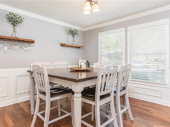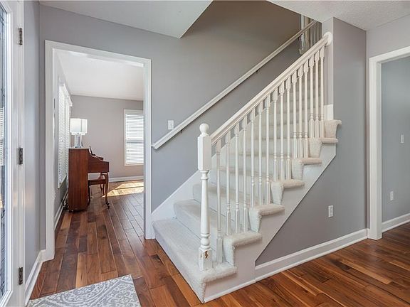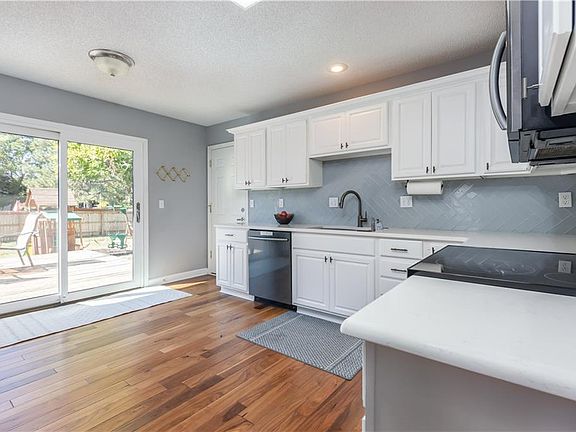 Beautiful, updated 2 story on a corner lot in Shawnee! Stunning hardwood floors flow throughout the main level, welcoming you into a bright and inviting space. The entry leads to a formal dining room and an updated eat-in kitchen featuring sleek stainless steel appliances, crisp white cabinetry, and a picturesque view of the deck and backyard—perfect for enjoying breakfast each morning. Convenient half bath off the kitchen leads to a spacious living room, with marble fireplace and built-in shelving. Upstairs, you'll find generously sized bedrooms, including a stunning primary suite with soaring ceilings, double closets, and a fully updated en-suite bath with a dual vanity. The finished basement offers additional living space, complete with a wet bar and a bonus storage area. Step outside to the expansive fenced yard, featuring a playset and a spacious deck—ideal for making the most of those beautiful spring days!