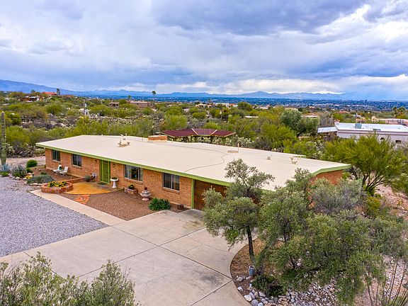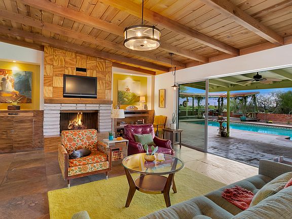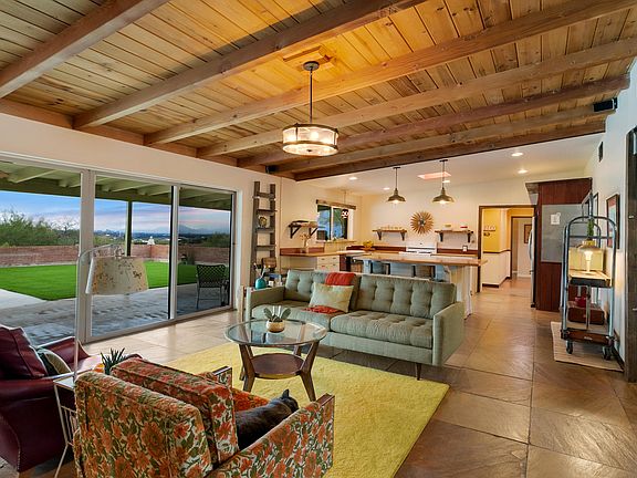 Classic Tucson Ranch home beautifully updated to reflect this wonderful era. 4BR with DEN and 3 Baths all on a private 1.6 ac hilltop. WOW views of the mountains and city everywhere. Beautiful tongue and groove beamed ceiling in the open great room featuring stunning fireplace with brick surround and custom wood design and wall of windows. Open kitchen defined by the stunning island w curly maple butcher block, also featured on kitchen counter tops. Wainscoting on accent wall in kitchen brings depth and character to the room. Classic red concrete floors throughout the entire home. Stunning back yard frames the views of the downtown w sparkling pool and amazing deck/ramada. Spacious guest bedrooms with beautiful paneled accent wall in each. Spacious master, walk in closet, large bath with