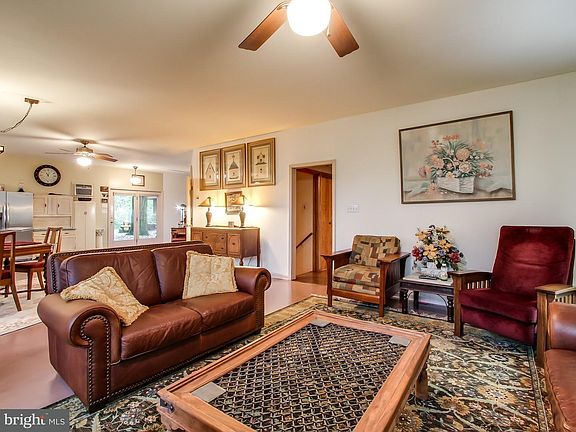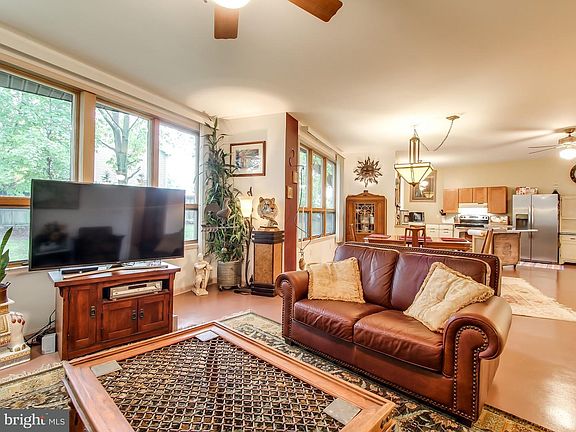 This is not your typical rancher. It has an open floor plan....concrete flooring. Classy look throughout. Third bedroom is a walk through bedroom. Second full bath in basement. Plenty of storage in basement. Wheelchair access. Hot tub stays. Brick patio. Steam shower / whirlpool bathtub, wood fireplace in bedroom. Powder room. H2O is 2 years old. Roof and siding are 2 years old. 10 foot high ceilings. 100 acres of woodland to the rear. Storage building with workbench.