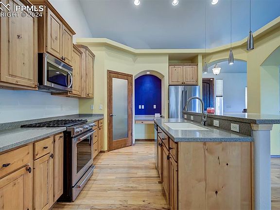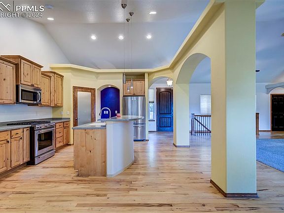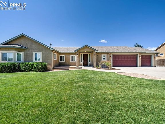 Beautiful ranch home in Park Vista Estates is handicap accessible. This custom ranch home sits on nearly 1/2 acre with beautiful Pikes Peak views. Gourmet kitchen has a large island with sink and breakfast bar. There's plenty of storage in the knotty alder cabinets and 2 pantry closets. All kitchen appliances stay. Living room is relaxing with inlaid carpet and corner gas fireplace. Large main level master suite offers walk-in closet and a 5 piece master bathroom. 2nd and 3rd bathrooms have their own bathrooms and walk-in closets. 2nd bedroom and bathroom wheelchair accessible. There's a main level office room as well. The large family room in the basement can accommodate a pool table and then some. There is also a theater room with a stadium seating platform. Could be used as a fitness room as well. 3 car garage is deep enough for full size trucks and SUV's. Back yard has a large storage shed and there is plenty of room for an RV garage/shop, a garden and RV parking. Riding mower is included. Rear fence is constructed with steel posts for easy updating.