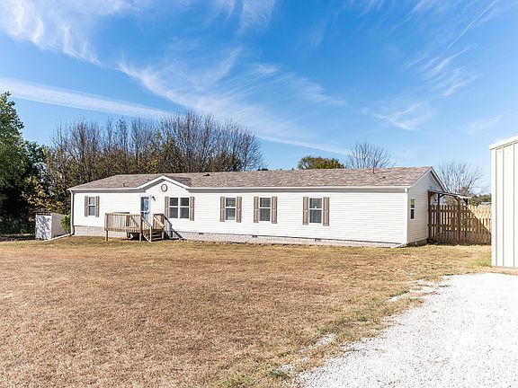 Welcome to your serene retreat! This spacious manufactured home on land is situated on a generous 2.5 acres, offering plenty of room for outdoor activities and privacy. The location is a country feel with easy access to 13 Hwy making your trip to Bolivar or Springfield a breeze! This home boasts 4 bedrooms and 2 bathrooms, including a large primary suite with a walk-in closet and an additional side room, perfect for a home office or nursery.Enjoy cozy evenings by the fireplace in the living room, which flows seamlessly into the dining area and kitchen.Walk outside to a huge partially covered back deck, ideal for entertaining or relaxing while enjoying the beautiful surroundings. The property also features a chicken coop for your farming aspirations and a back shed for additional storage or farm animal shelter.The massive shop (1200 sqft) provides ample space for recreation, parking cars, or pursuing hobbies. The shop is conveniently connected to the porch for easy access to the home.Recent updates include new roof and gutters in the past 2 years, new front door scheduled to be installed, and recent deck repair.This property is being sold as-is, and the motivated owners are eager to find the right buyer. Don't miss out on this unique opportunity to own a piece of paradise!