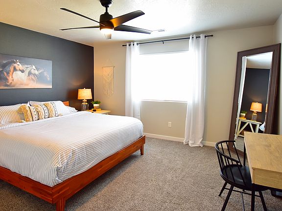 Welcome to this adorable single-level home, ideally located near the Eagle-Meridian border with loads of shopping & dining. Your little ones will have a blast at the nearby community park just steps away. Enjoy cooking at home with the BBQ grill, large patio and fully stocked kitchen. Grab the bicycles or stroller and take a stroll along the Boise River Greenbelt, where you'll soak in stunning river views and scenic nature trails just minutes away. Game room with ping pong, 55" TV with a couch and game system, and Basketball shooting game. End your day in our incredibly cozy beds for a peaceful night's sleep. Living Space Open living area with vaulted ceilings with loads of light. Comfortable seating with extra pillows and throws. Large Screen Smart TV with all of the streaming options you can log into for hours of entertainment. Kitchen Well stocked kitchen with everything you will need to enjoy cooking at home or just to hangout with light snacks and great conversation. Full set of pans, mixing bowls, trays, utensils, dishes, silverware, glasses, and spices, all available for your use. Coffee! We have included a drip coffee maker with filters, plus a pour-over with coffee, cream and sugar provided. Dining room table with seating for 4 plus 3 bar stools at the counter for your comfort and convenience. Full size refrigerator, full oven, microwave and a tea-pot with provided teas to enjoy. Open to the living area so you can enjoy cooking and still be part of the conversation. Primary Suite Beautiful king-size bed with a memory foam mattress for extra comfort. Large nightstands with elegant lamps provide ample room for your items, reading materials and to plug in your phone. Full length mirror in the corner, a welcome addition while preparing for your day. The primary bath includes a shower, dual vanity, and a large walk-in closet with a dresser that doubles as a luggage stand. The Pack-n-Play and high chair are stored in primary closet with sheets if you need them. Shampoo, conditioner, body wash, bath towels and hand towels are provided. Makeup wipes, a makeup mirror, a hair dryer, disposable razors, q-tips, and even individually wrapped toothbrushes provided in case you happened to forget something. 2nd Bedroom Beautifully decorated with a super comfortable queen bed, nightstand and lamp. Includes a closet with hangers for your clothing. 3rd Bedroom Such a cute bedroom that features 2 Twin XL beds with super high quality mattresses that are so incredibly comfortable. A closet is also included in this room for your use. Patio/Backyard Fully Fenced yard with grass. Oversized patio with a dining table, sitting area and a BBQ for your enjoyment. Garage Garage converted to a game room with 65" TV, Ping Pong, and a Basketball game. 2 cruiser bikes for exploring the area. We've added a basket to one of the bikes, great for bringing along extra items. For Mid and Long Term guests, parking for 1 vehicle can be made available upon request. Please note: This area has a supply cabinet that is locked and not accessible, used to re-supply the home between stays. This newer community is an attractive, centrally located area with wide tree lined streets and lots of open spaces in a quiet and peaceful area. It boasts quick access to everything for you to enjoy all the Treasure Valley has to offer. Costco - 2 miles Walmart - 2 miles Orchard Park - 3 miles Boise River Greenbelt Access 6 miles Eagle Island State Park - 6 miles Idaho Center Concert Venue and Event Center (Rodeo) - 6 miles Downtown Meridian - 6 miles The Village at Meridian - 8 miles Downtown Eagle - 8 miles Roaring Springs Water Park and Wahooz Family Fun Center - 8 miles Western Idaho Fairgrounds and Expo Idaho - 10 miles Top Golf - 11 miles Eagle Bike Park (Mountain Biking and BMX) - 12 miles Airport - 17 miles Downtown Boise - 18 miles Ste Chappelle Winery - 23 miles Bogus Basin Recreation Area (Skiing and Mountain Biking) - 30 miles *All utilities are included *Pet fee of $64/pet is required per stay (maximum 2). Damage is the responsibility of tenant. *Lawn included so staying in this home is simple and care free. *Garage can be converted to parking for 1 vehicle for longer stays. *This is a No smoking property *Mid Stay clean required at least monthly ($175/clean) *Monthly Manager walk-through required *Rental Agreement must be signed.