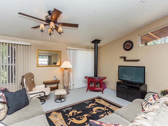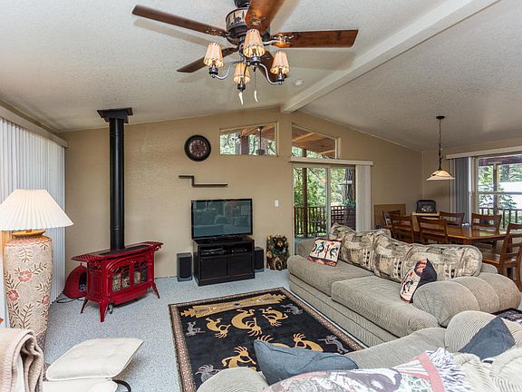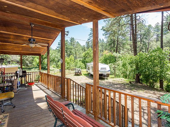 Tall pines, corner lot across from the Nat'l Forest & abutting a seasonal creek. The location does not get any better! Adorable main house has a metal roof with a huge COVERED wrap around deck and separate guest quarters. Open great room floor plan with island kitchen, guest bedroom with full guest bath, master suite and laundry room. Guest quarters offer a living room, bedroom and bath. There is plenty of level parking, a storage shed/workshop and patio with built in BBQ. .6 miles to the Square on paved roads. All Furniture conveys!