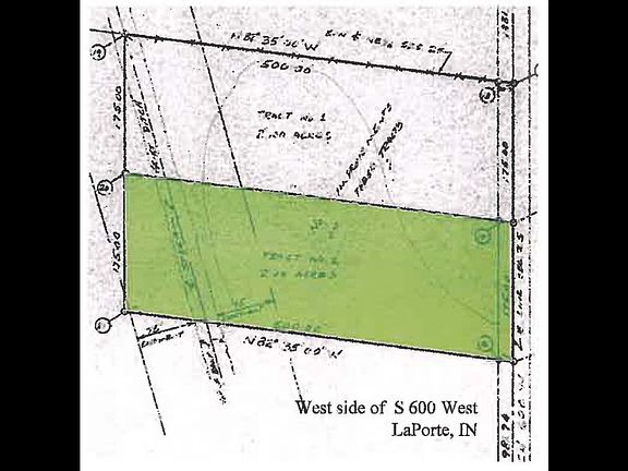Are you ready to build your dream home in the county? Here is the perfect 2 acres for you. The lot is partially wooded, some tillable, and there is a creek that runs through it. Land is marked with orange flags, 175' road frontage. Land is located between LaPorte and Westville. Close to PNC, toll road and I-94. Welcome Home.