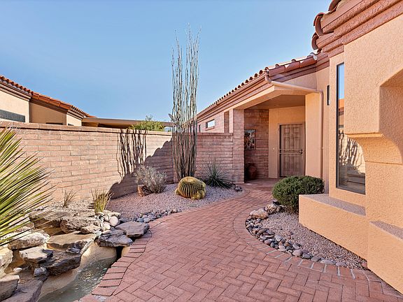 Welcome to your dream home in the heart of San Ignacio Vistas offering unparalleled and captivating views of the Santa Rita mountains. Every corner of this home reflects the meticulous craftsmanship and care poured into its design and maintenance, ensuring a residence of exquisite quality and enduring beauty. Upon entry, guests are greeted by a beautifully landscaped courtyard adorned with a tranquil water feature, setting a tone of serenity and elegance from the moment you arrive. Step into the grandeur of the great room, where soaring ceilings create an atmosphere of spaciousness and sophistication. This expansive living area seamlessly transitions into the well-appointed kitchen, allowing you to entertainment without the need for simultaneous meal preparation. Discover the elegance of plantation shutters gracing the windows, allowing for customizable natural light and privacy throughout the day. Also, embrace the convenience and peace of mind provided by the newer HVAC system and brand-new water heater, promising years of efficient performance and comfort. Make your way to the primary suite and indulge in the ultimate relaxation experience with a beautiful seating area, where you can unwind while savoring panoramic mountain vistas that stretch as far as the eye can see. This ingeniously designed floor plan also offers an additional primary suite, convenient for guests to have their privacy and space to unwind after enjoying everything Green Valley and the surrounding areas have to offer. Whether it's enjoying your morning coffee or stargazing in the evening, the serene outdoor space offers the perfect retreat from the hustle and bustle of daily life with fascinating mountain views from every corner and an additional water feature providing a calming effect and enhancing your relaxation experience. Don't miss the opportunity to make this exceptional property your own and immerse yourself in the unsurpassed beauty and comfort it offers.
