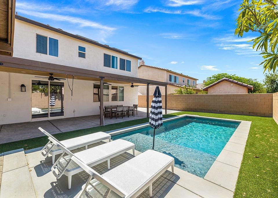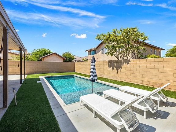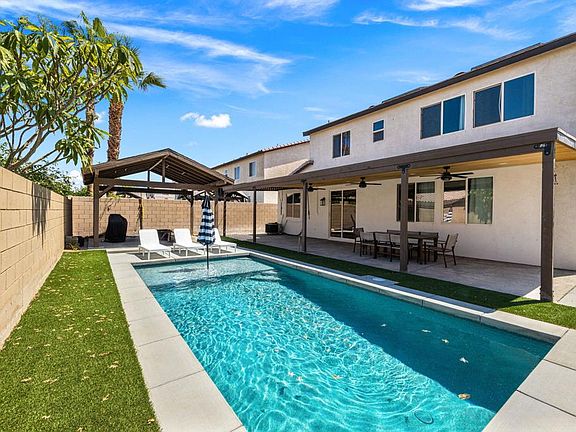 Home two doors down sold for $810k. This impressive property comes fully furnished and offers a perfect blend of modern amenities and stylish features, making it an ideal choice for both homeowners or investors seeking short or long-term rental opportunities. Dive into relaxation with a new pebble-tec pool, featuring a large tanning shelf great for kids or lounging in the sun. The pool can be controlled by your phone and heated if desired. Host gatherings in style under the expansive covered patio, great for entertaining with family and friends. Once inside, the open floor plan seamlessly connects the living, dining, and kitchen areas, highlighting the updated flooring and decorative fireplace. The primary suite includes a large walk-in closet, dual sinks, a soaking tub, and a walk-in shower, offering a spa-like retreat. Situated near shopping, dining, golf, and the Empire Polo Fields host to music festivals and much more. Solar panels for energy efficiency, a spacious three-car tandem garage with epoxy floors, along with RV parking provide ample space for vehicles and storage. This property offers convenient access to everything you need for a vibrant lifestyle. Don't miss this exceptional home that combines comfort, convenience, and investment potential. Schedule a viewing today and come experience desert living!''