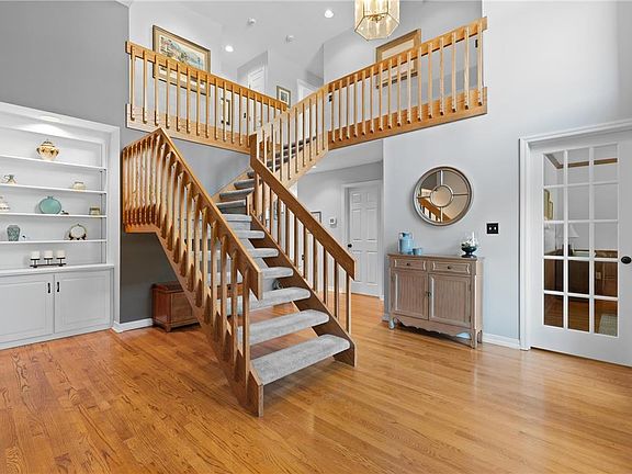 This beautiful 4-bedroom home in the East Penn School District blends classic elegance with modern functionality. Upon entering you are welcomed by a grand two-story foyer featuring a Palladian window and elegant staircase. A formal living room and office with custom cabinetry offer charm and function, while the formal dining room provides scenic backyard views. The heart of the home is the open-concept kitchen and family room with a large island, Italian tile floors, and ample cabinetry. Sunlit windows in the breakfast nook overlook one of two Trex decks that lead to the newly fenced backyard, complete with a fire pit, garden, shed, and stone patio. The family room boasts a floor-to-ceiling brick fireplace, two-story windows, a wet bar, and access to a private second deck, perfect for gatherings. Upstairs, the spacious master suite includes a luxurious en-suite bathroom with a Jacuzzi tub, walk-in shower, and expansive closet. Three additional bedrooms and a full bath complete this level. The fully finished lower level provides a second family room, game room, wet bar, storage room, and a full bathroom, opening onto the stone patio—ideal for guests or multi-generational living. Additional highlights include an oversized three-car garage with mudroom access and first-floor laundry. With its luxurious amenities, ample space, and prime location, this home is a must-see!