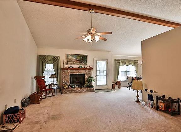 Wonderful 3 Bedroom, 2 full Bath, one owner, Ranch style home with 1500+ sq ft of living space & an amazing open floor plan. Beautiful brick exterior with vinyl siding, covered, columned front Porch welcomes you in to the Entry Foyer & the start of the open floor plan from the Great room, to the Dining room & the Eat in Kitchen all with wood beamed vaulted ceilings. Great room features a raised hearth brick gas fireplace, a walkout to the back Patio & opens to the Dining room. Fabulous Eat in Kitchen features Bay windows, ample cabinetry with pull out drawers, double sink, tile back splash & appliances including a dishwasher, smooth top electric range/oven & range hood. Master Bedroom Ensuite with wood beamed vaulted ceilings, walk in closet, walk out to back Patio & private Bath with double sink vanity & separate soaking tub/shower. Secondary Bedrooms with double door closets. Main floor Laundry room. 2 car Garage with work bench. Level lot & a 30X11 covered Patio to enjoy.