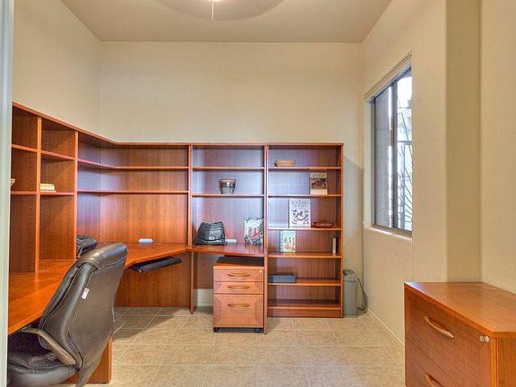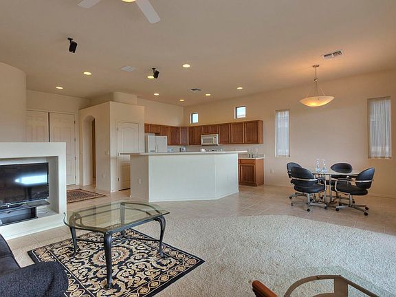 Extra Large east backyard. With a covered patio and easy care landscaping. Super quiet and private with views of the mountains. This home has an open floor plan with 2 bedrms-split, den, laundry room and oversized garage. The ceilings are 10ft high, good lighting and fans in all the living spaces.